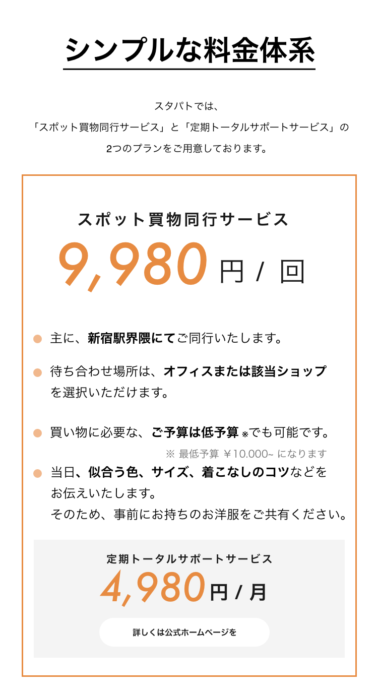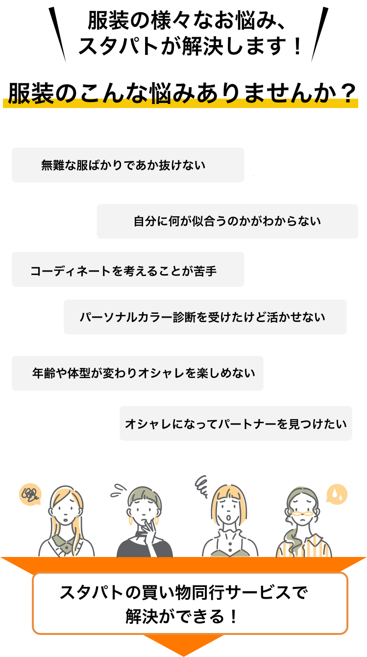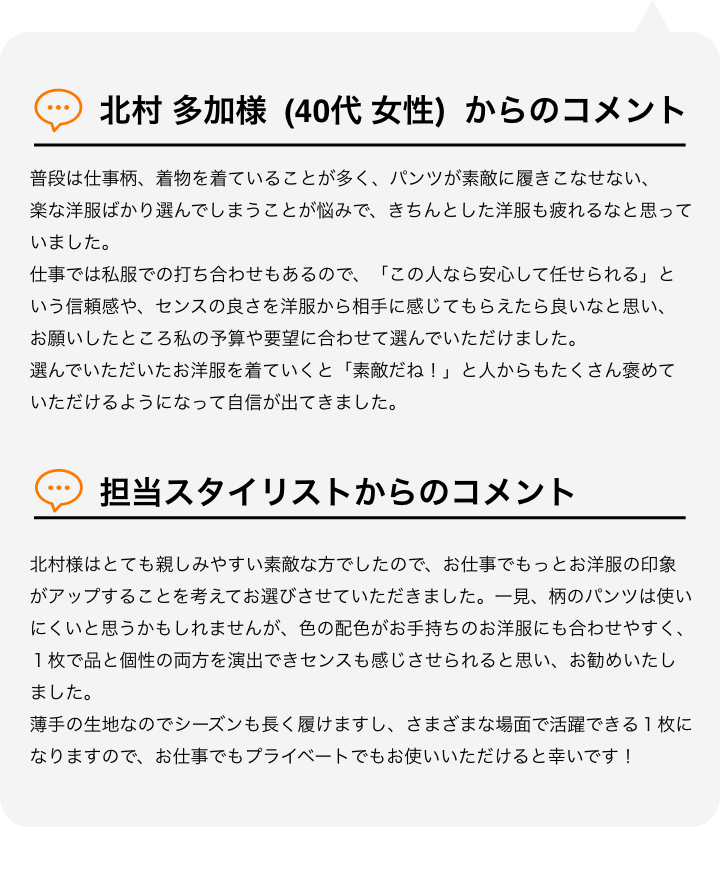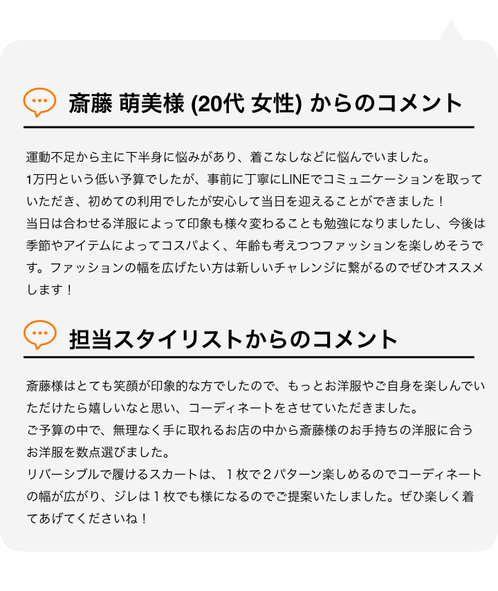 ファストファッションを使ったコーディネートから、百貨店ブランドまでお客様のご要望に合わせたご提案が可能です。